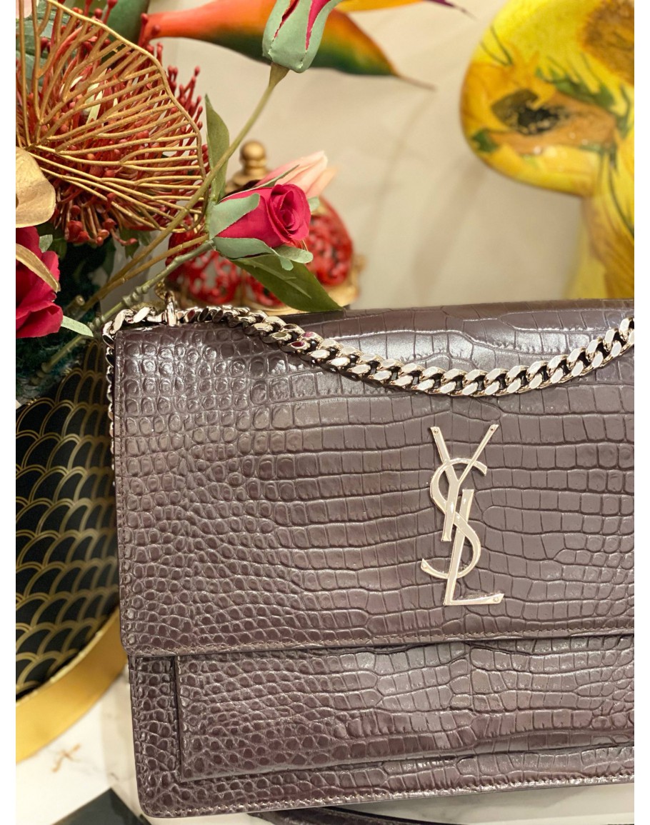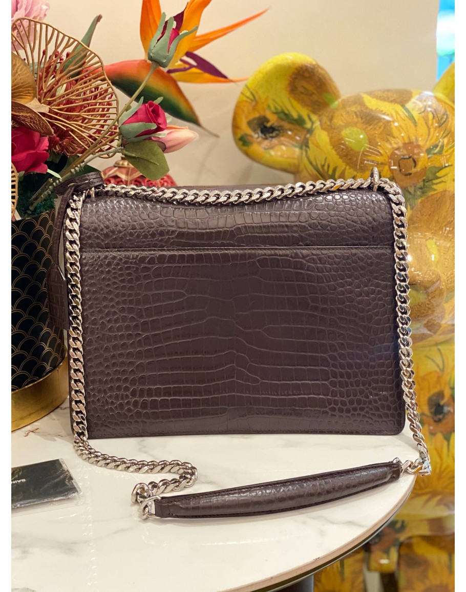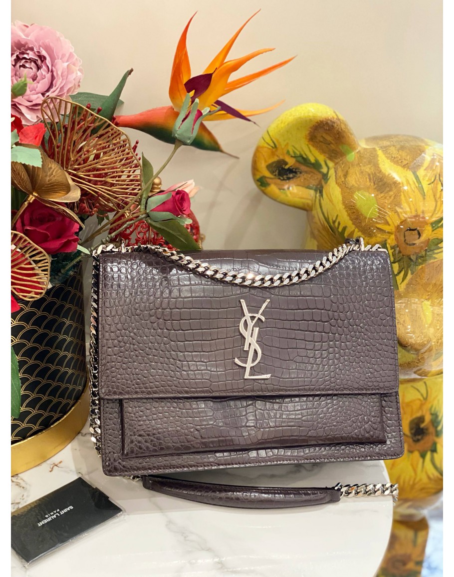 (LIKE NEW) YSL SAINT LAURENT SUNSET LARGE IN DARK BROWN CROCODILE EMBOSSED LEATHER SILVER HARDWARE -FULL SET-