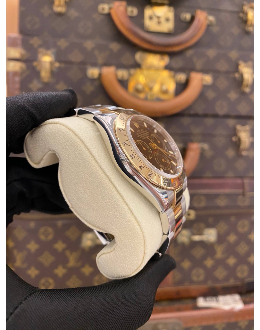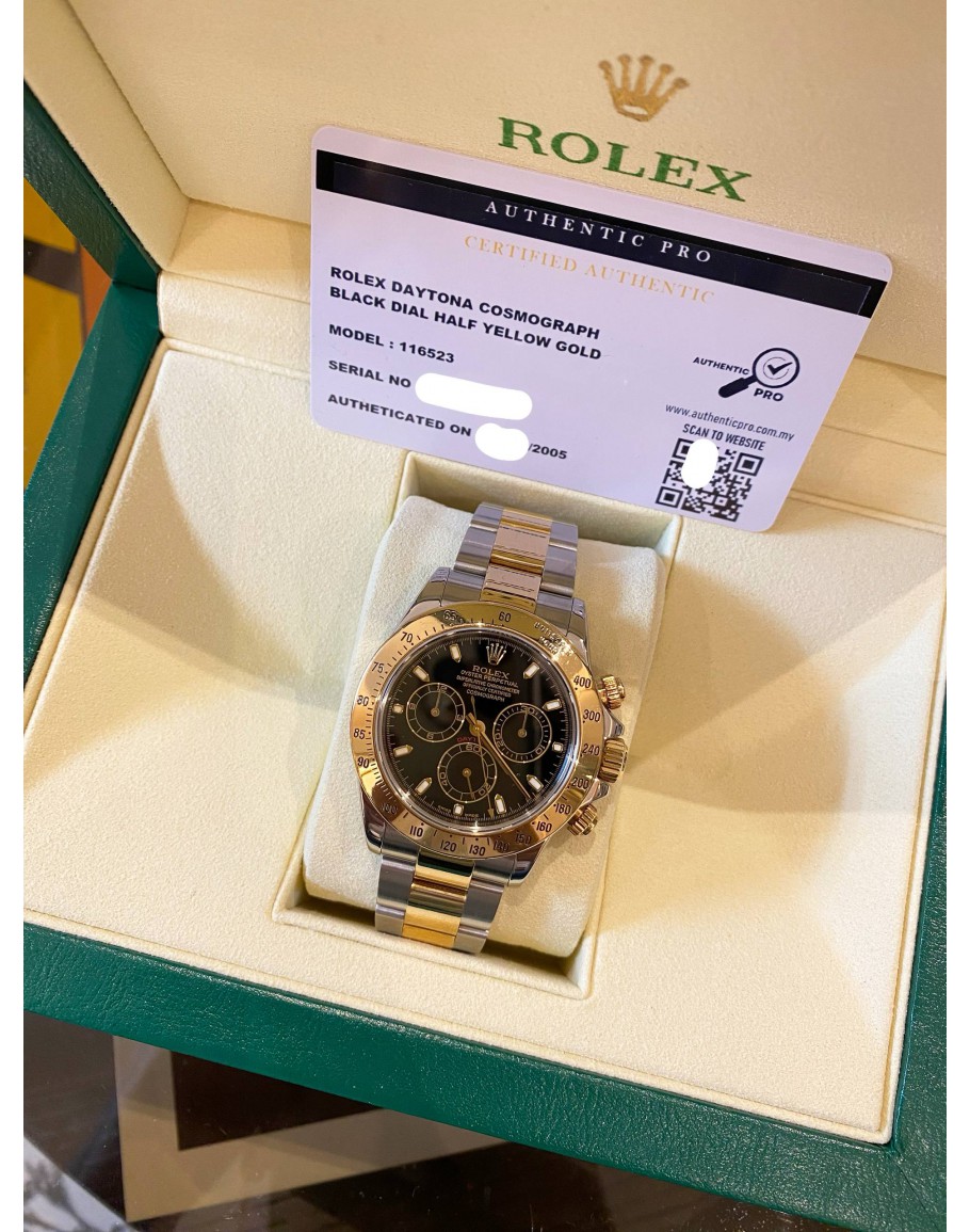 (PRE-OWNED) GENDER : MEN PRISTINE CONDITION : 9.5/10 BRAND : ROLEX YEAR : 2005 MODEL : DAYTONA COSMOGRAPH REFERENCE NUMBER : 116523 CASE DIAMETER : 40MM MOVEMENT : AUTOMATIC BEZEL MATERIAL : 18K 750 YELLOW GOLD CASE MATERIAL : 18K 750 YELLOW GOLD & STAINLESS STEEL BRACELET MATERIAL : 18K 750 YELLOW GOLD & STAINLESS STEEL CLASP : FOLDING CLASP CLASP MATERIAL : STAINLESS STEEL DIAL : BLACK COMES WITH : AUTHENTIC CERTIFICATE CARD & BOX