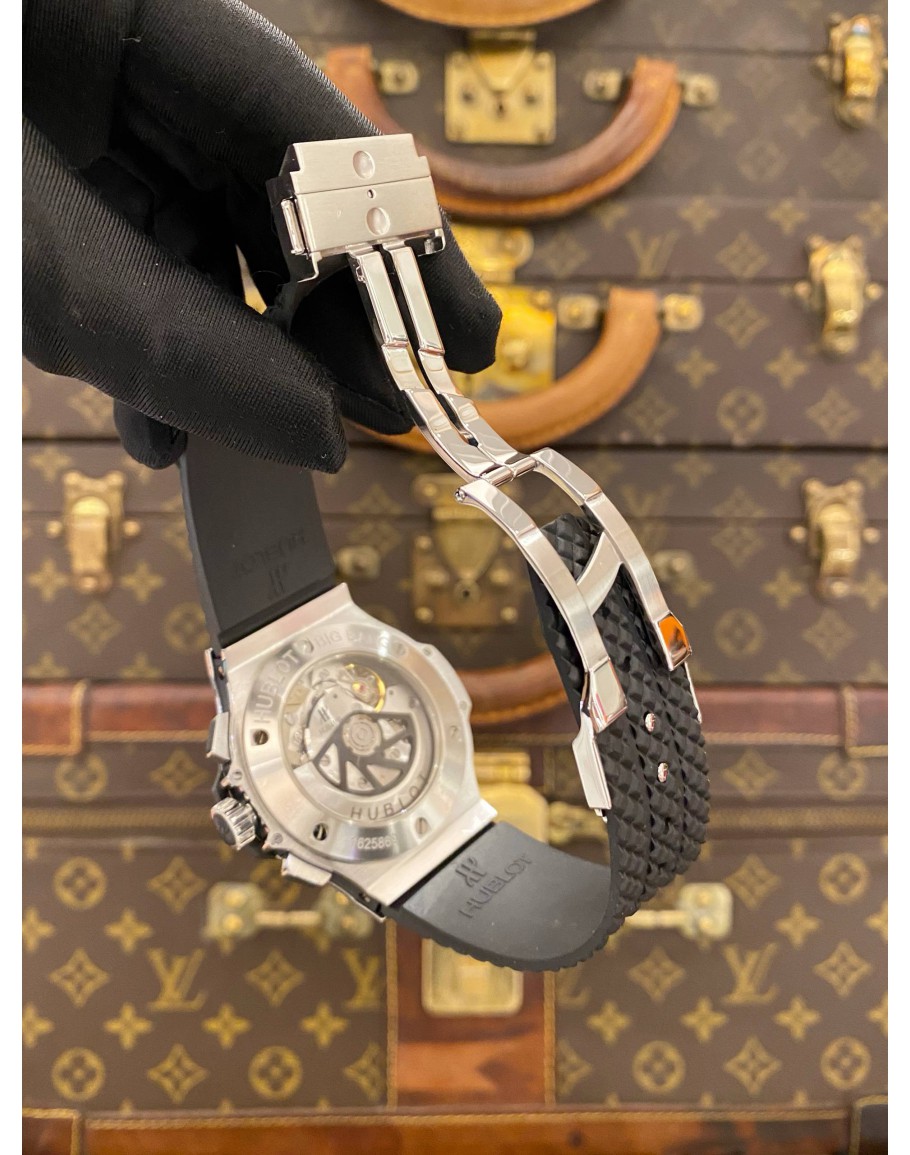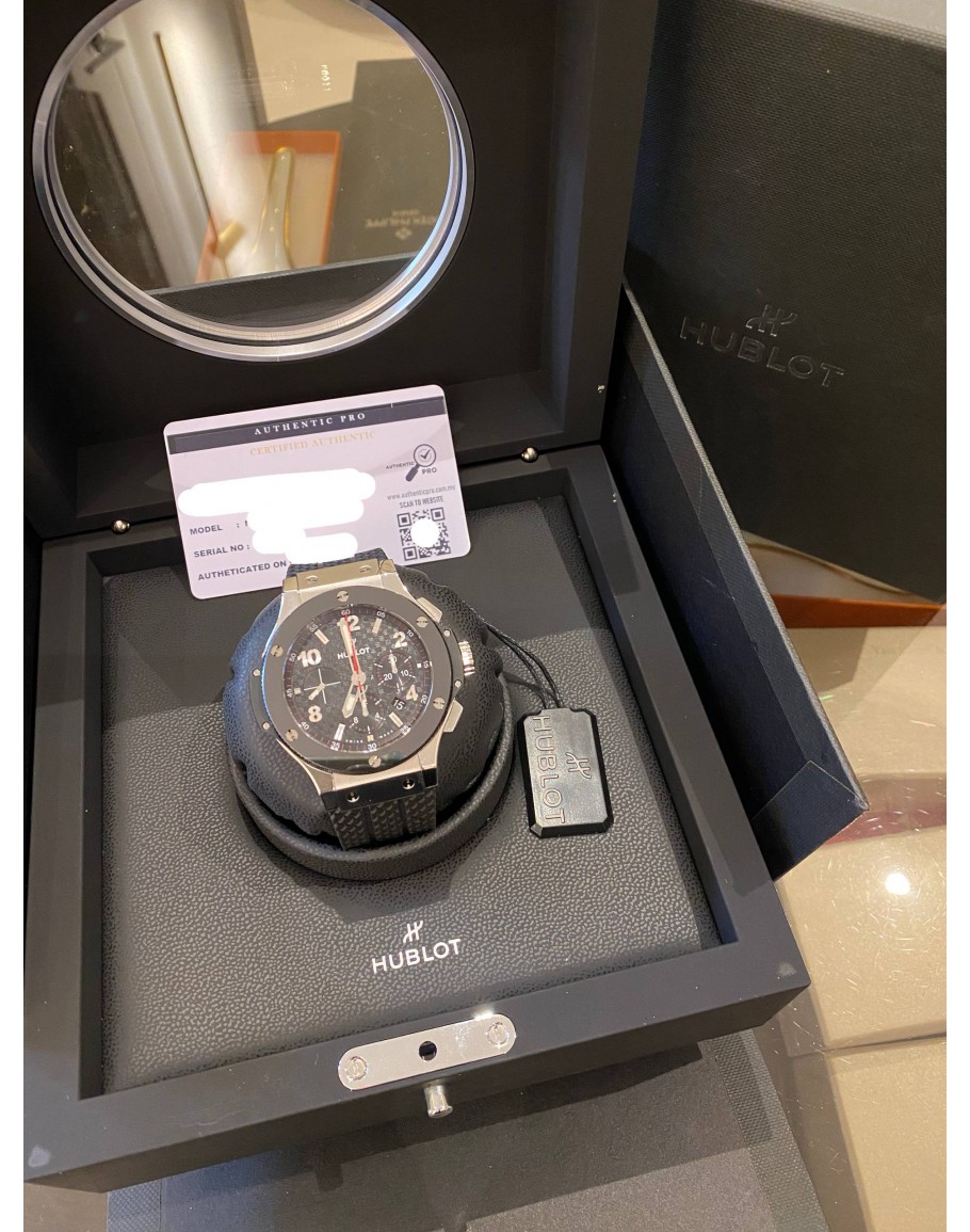 (PRE-OWNED) GENDER : MEN PRISTINE CONDITION : 9.5/10 BRAND : HUBLOT YEAR : 2023 MODEL : BIG BANG STEEL CERAMIC CHRONOGRAPH REFERENCE NUMBER : 301.SB.131.RX CASE DIAMETER : 44MM MOVEMENT : AUTOMATIC CASE MATERIAL : STAINLESS STEEL BEZEL MATERIAL : CERAMIC BRACELET MATERIAL : RUBBER CLASP : DEPLOYANT CLASP CLASP MATERIAL : STAINLESS STEEL DIAL : BLACK COMES WITH : AUTHENTIC CERTIFICATE CARD, TAG & BOX