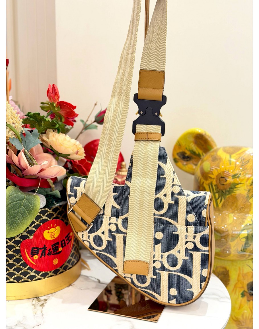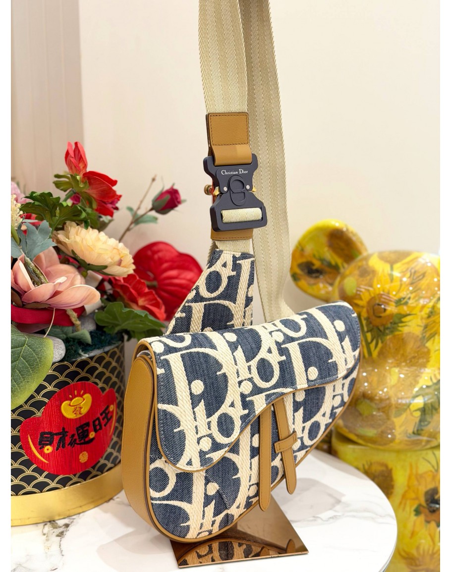 CHRISTIAN DIOR SADDLE IN BLUE OBLIQUE EMBROIDERY WITH TAN LEATHER TRIM