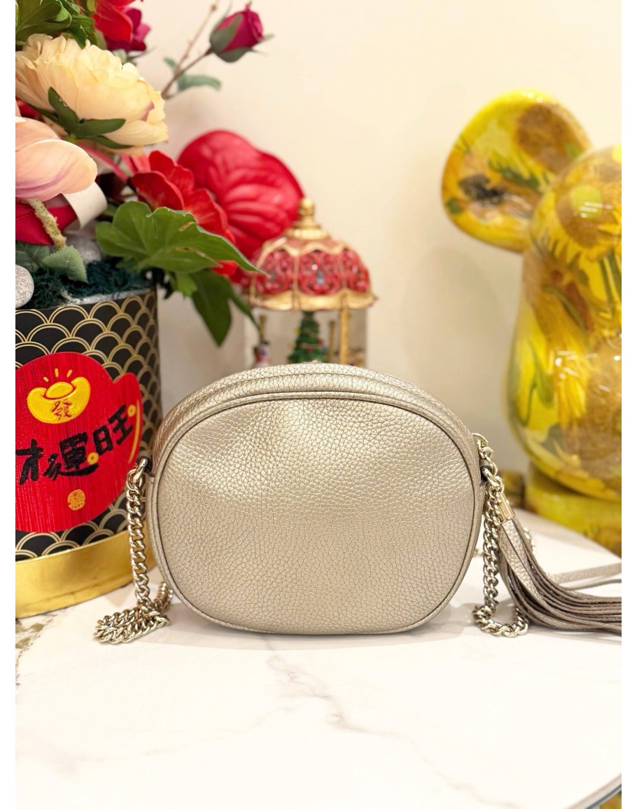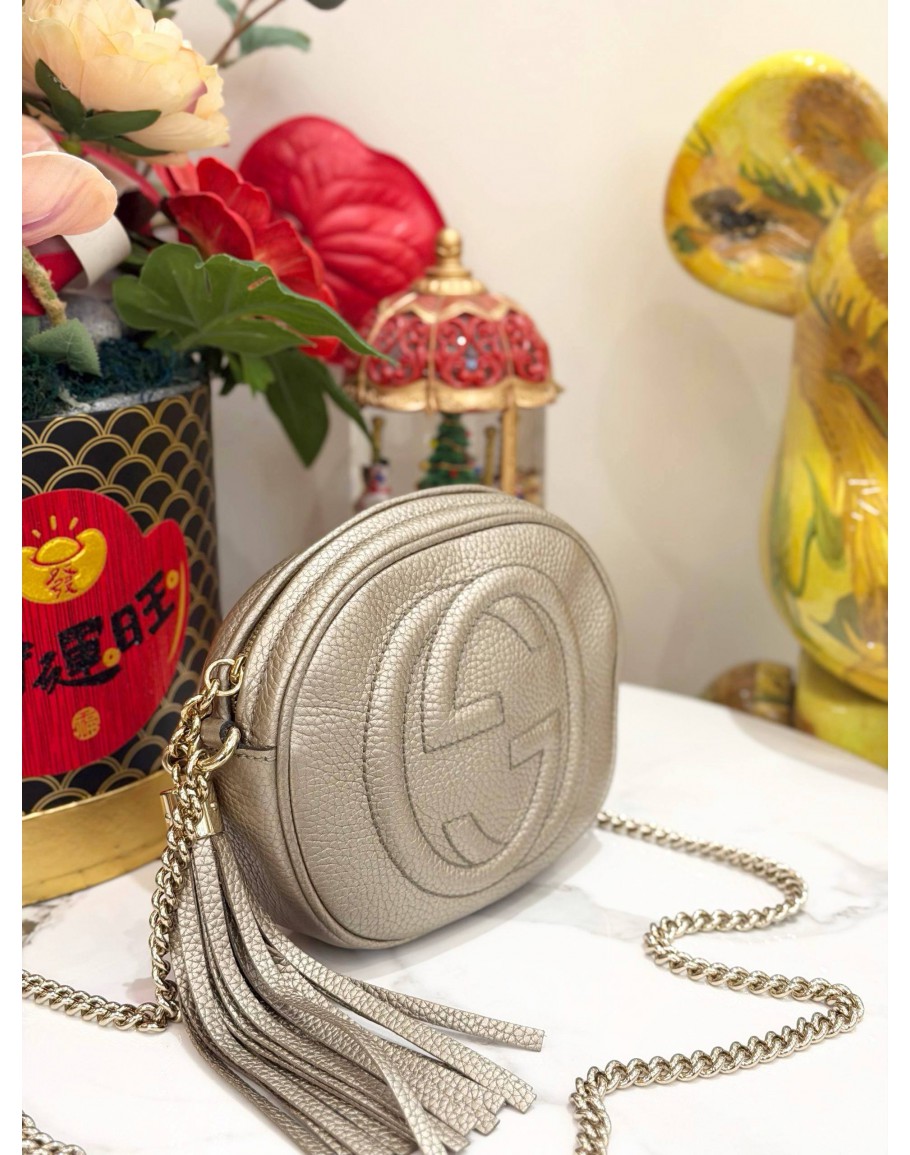 Tags: GUCCI MINI SOHO DISCO CHAIN CROSSBODY BAG IN PEBBLED CALFSKIN GOLD