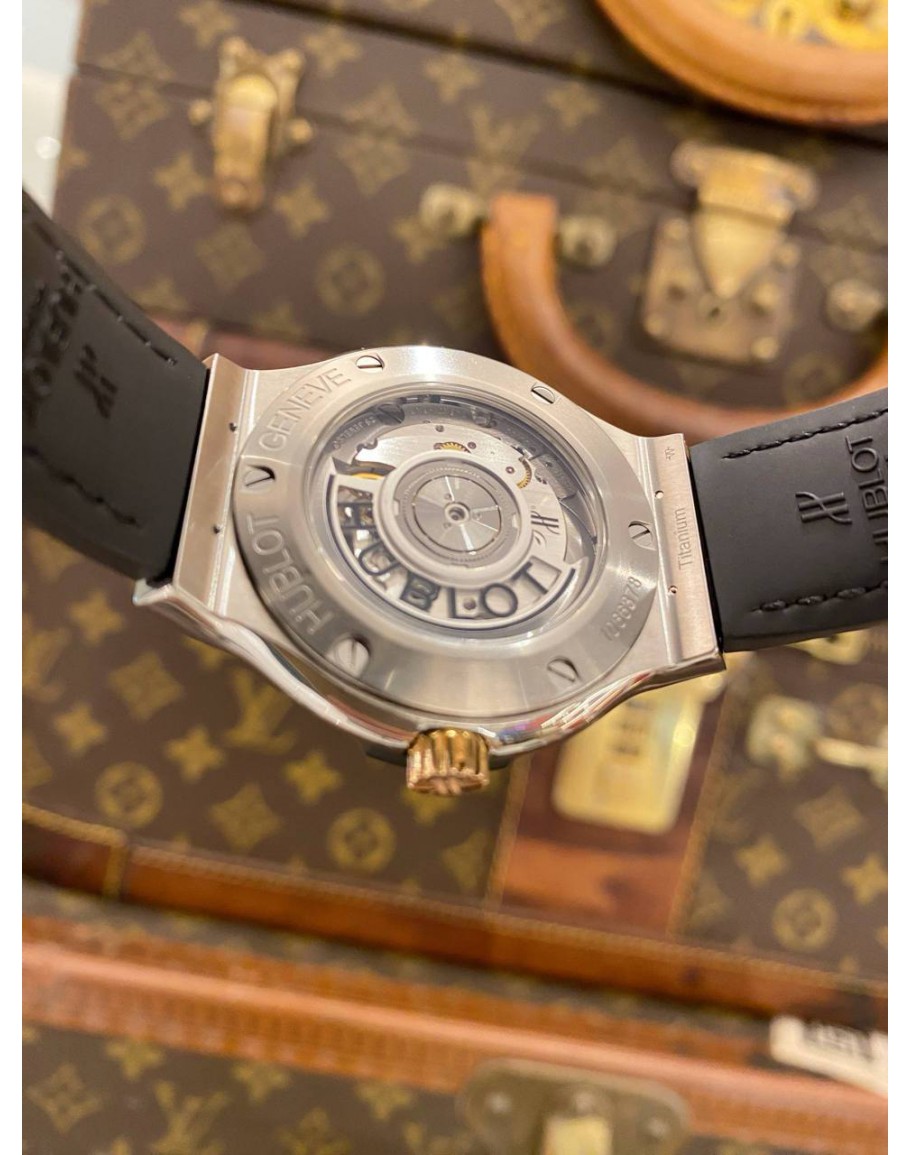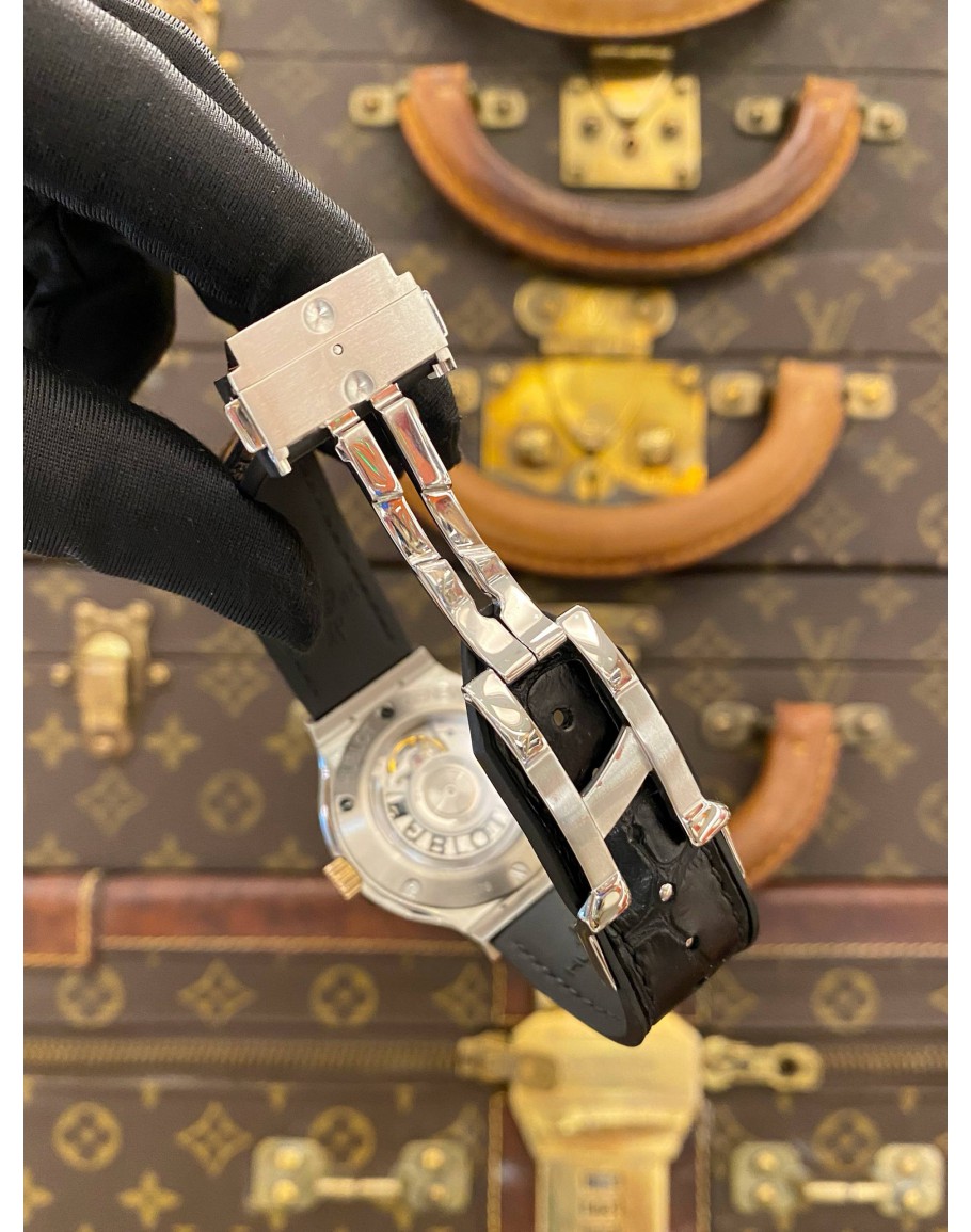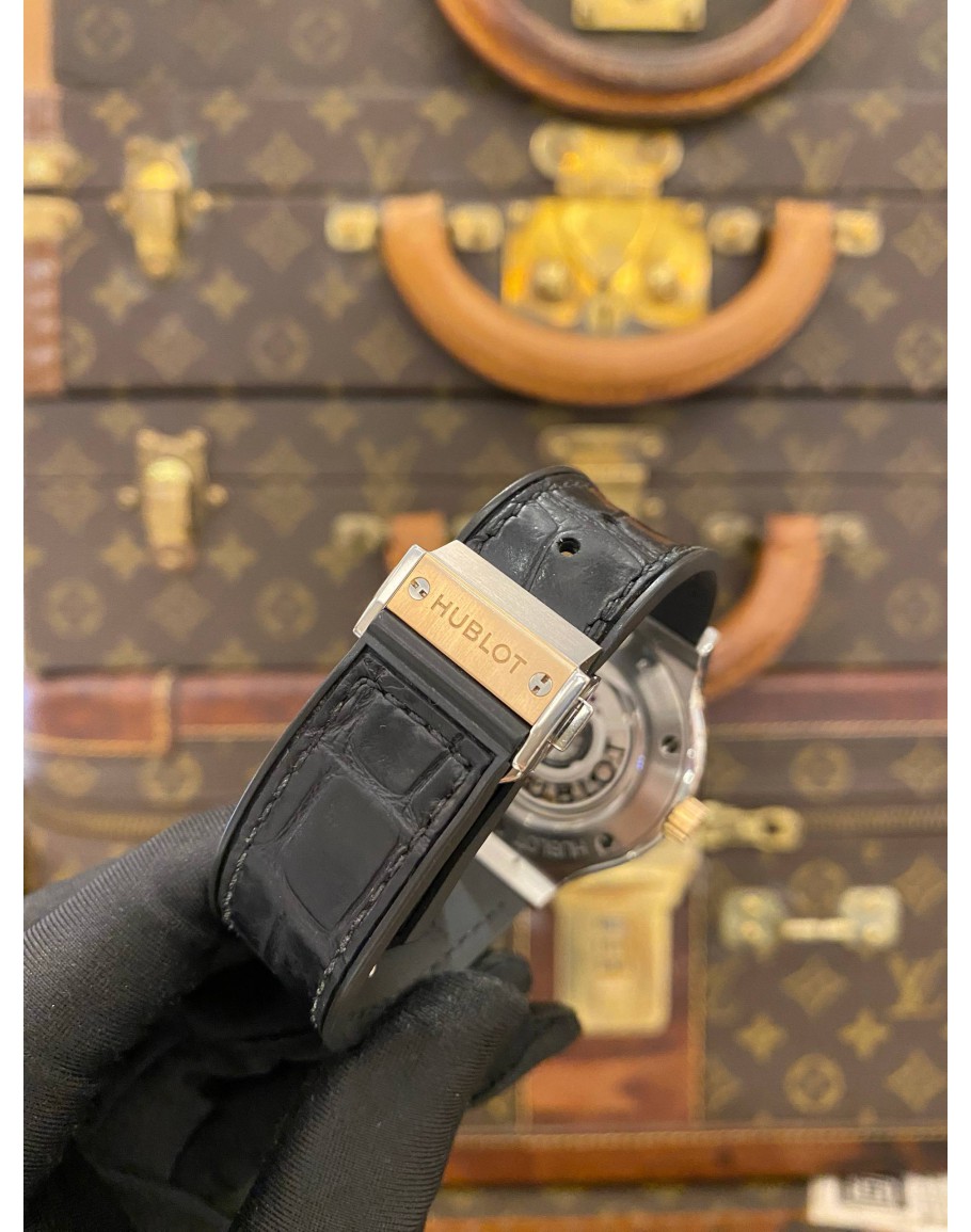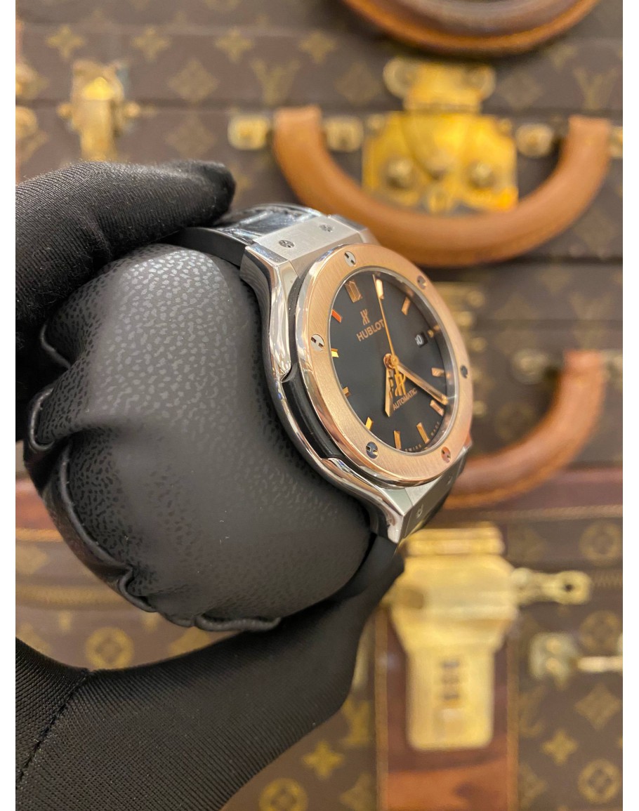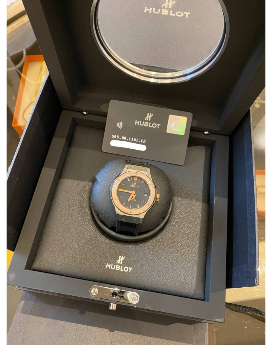 (LIKE NEW) -FULL SET- GENDER : UNISEX LIKE NEW CONDITION : 9.5/10 BRAND : HUBLOT YEAR : 2019 MODEL : CLASSIC FUSION REFERENCE NUMBER : 565.NO.1181.LR CASE DIAMETER : 38MM MOVEMENT : AUTOMATIC BEZEL MATERIAL : 18K 750 ROSE GOLD CASE MATERIAL : TITANIUM & 18K 750 ROSE GOLD BRACELET MATERIAL : BLACK ALLIGATOR LEATHER WITH RUBBER LINING CLASP : DEPLOYANT CLASP CLASP MATERIAL : 18K 750 ROSE GOLD & STAINLESS STEEL DIAL : BLACK WITH GOLD INDEXES COMES WITH : AUTHENTICITY CARD & BOX