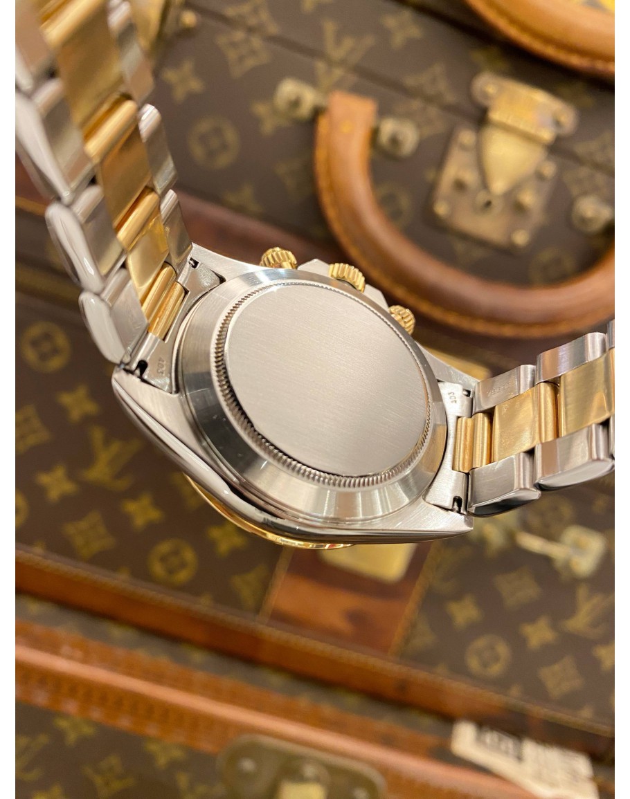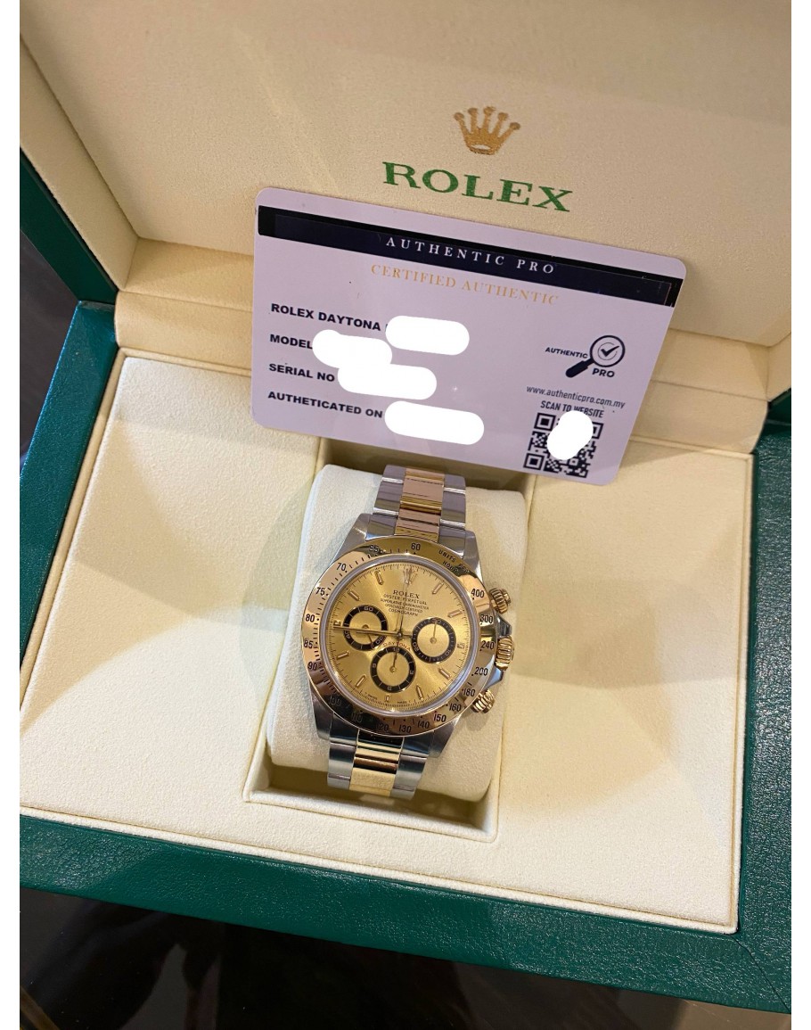 (PRE-OWNED) GENDER : MEN PRISTINE CONDITION : 9.5/10 BRAND : ROLEX MODEL : DAYTONA COSMOGRAPH REFERENCE NUMBER : 16523 CASE DIAMETER : 40MM MOVEMENT : AUTOMATIC CASE MATERIAL : 18K 750 YELLOW GOLD & STAINLESS STEEL BEZEL MATERIAL : 18K 750 YELLOW GOLD BRACELET MATERIAL : 18K 750 YELLOW GOLD & STAINLESS STEEL CLASP : FOLDING CLASP CLASP MATERIAL : 18K 750 YELLOW GOLD & STAINLESS STEEL DIAL : CHAMPAGNE COMES WITH : CERTIFICATE CARD OF AUTHENTICITY & BOX